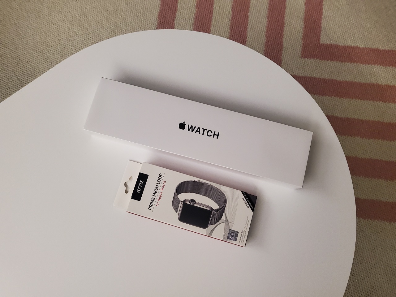✔ 밴드 상자를 여십시오. 상자에 포함된 단계에 따라 밴드를 Apple Watch에 연결하십시오.
