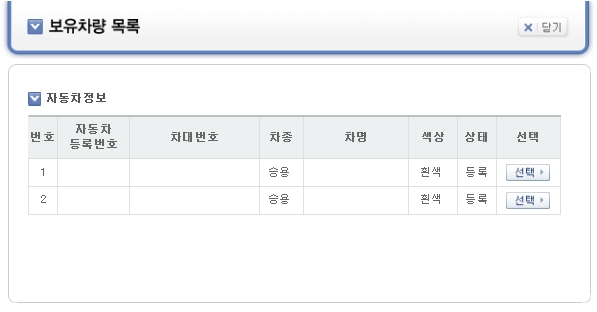자동차정보 > 선택 클릭 후 차량 선택