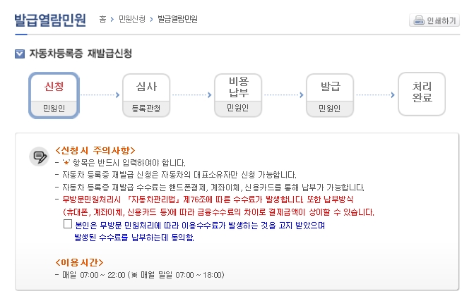 자동차민원사이트인 자동차365 에서 간단히 인터넷으로 재발급 신청후 바로 출력해서 사용할 수 있다.