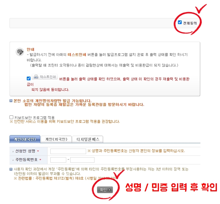 사용자 확인에서 전체동의 > 프린터테스트 > 개인정보 입력 후 확인