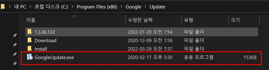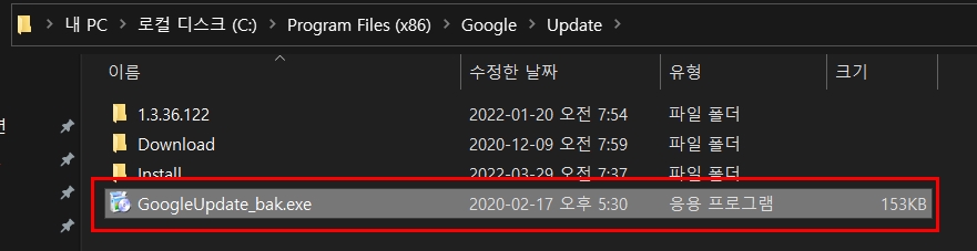 셋째, C:\Program Files (x86)\Google\Update 경로로 들어가서 GoogleUpdate 실행 파일 이름을 변경합니다.
