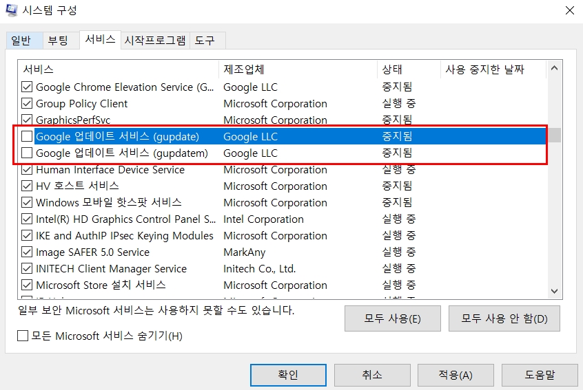 서비스 탭에 들어가서 Google 업데이트 서비스 2가지 (gupdate, gupdatem) 옵션을 체크 해제하여 확인 버튼을 누릅니다.