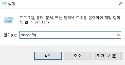 [Win키 + R] 또는 [실행창] 열기 > msconfig 를 입력해 엔터를 눌러 시스템 구성을 실행합니다.