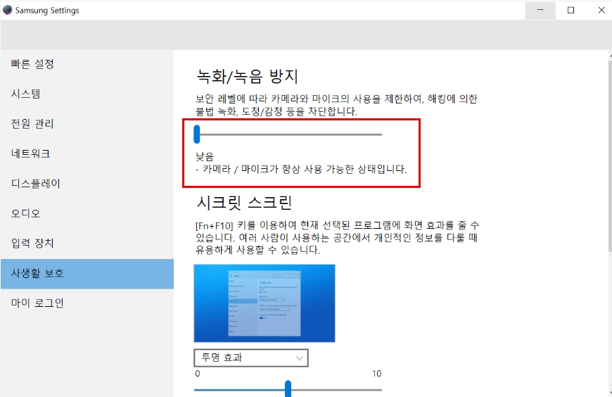 3. 녹화/녹음 방지 항목이 '높음'으로 설정되어 있는 경우 "중간" 또는 "낮음" 으로 설정 변경합니다.