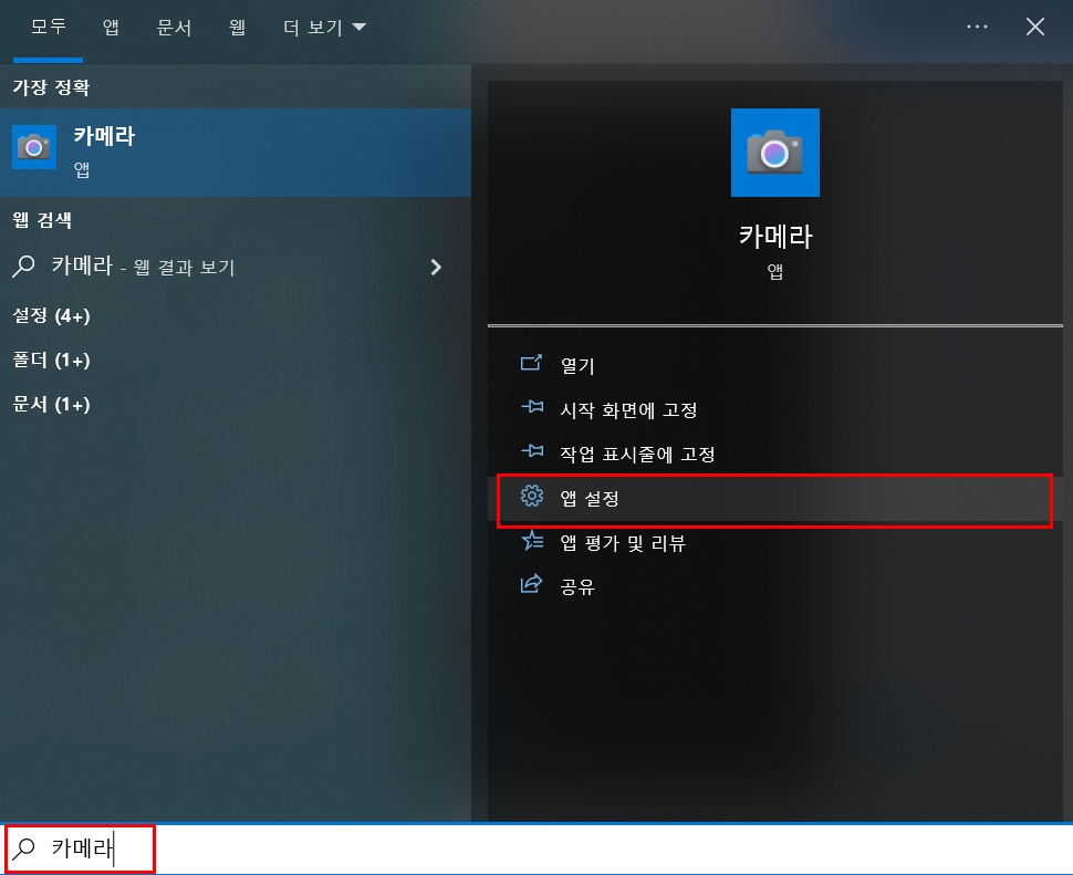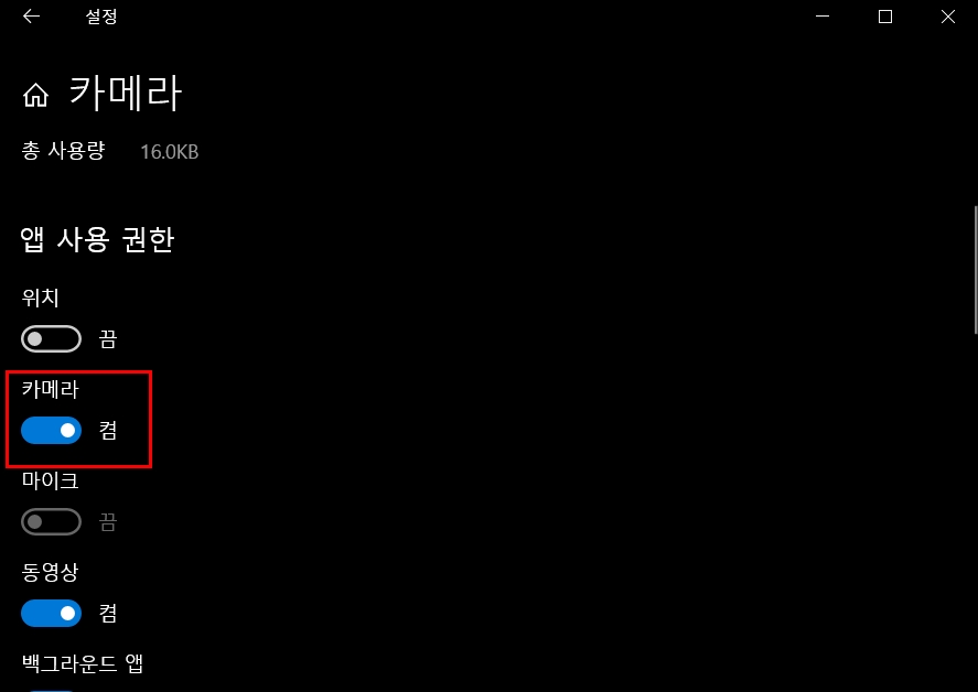 2. 카메라 앱 사용 권한 > 카메라 켬 설정