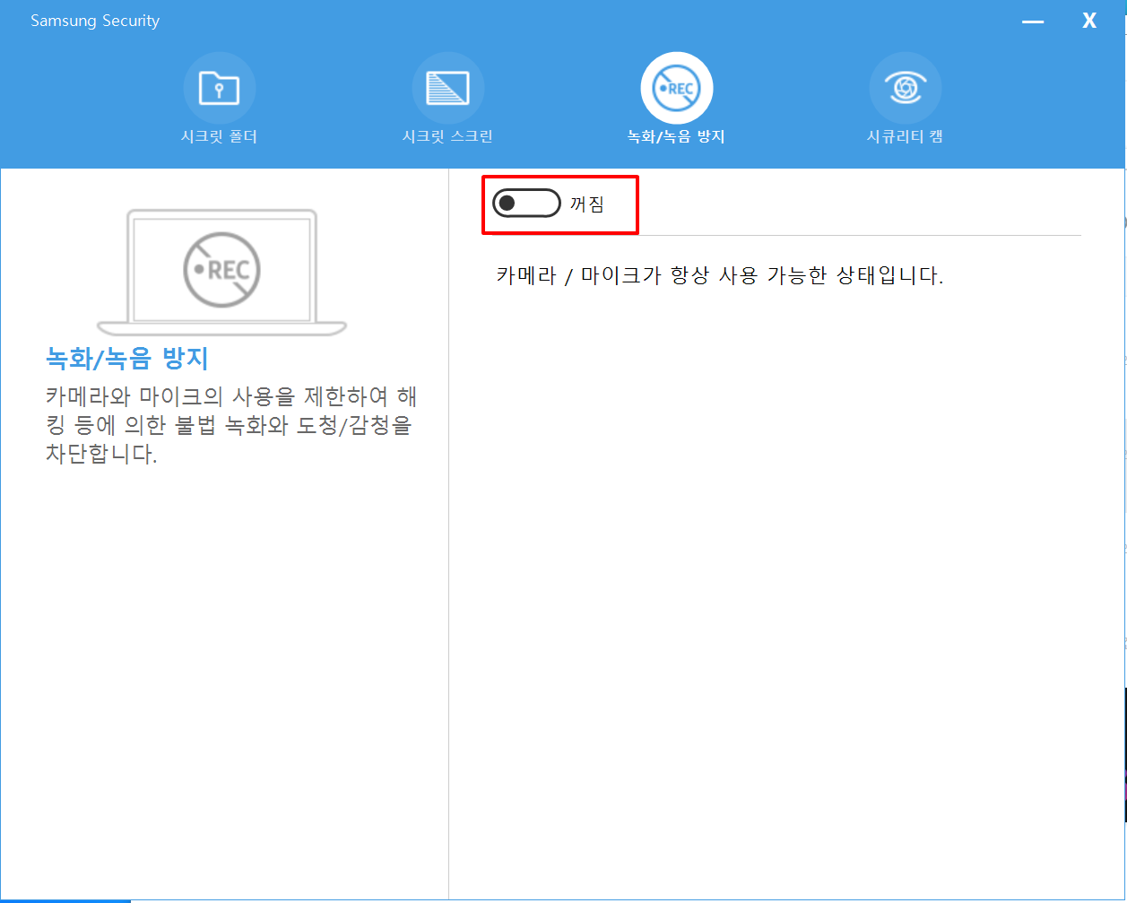 2. 녹화/녹음 방지 항목의 설정을 '켜짐' -> '꺼짐'으로 변경합니다.