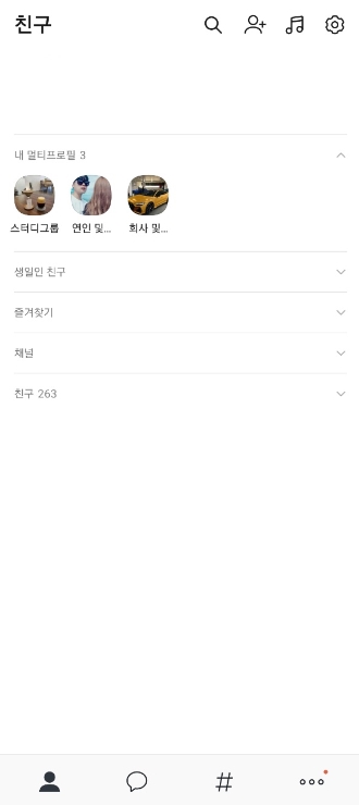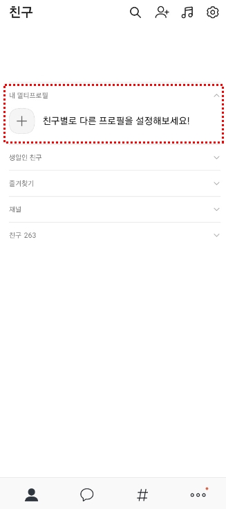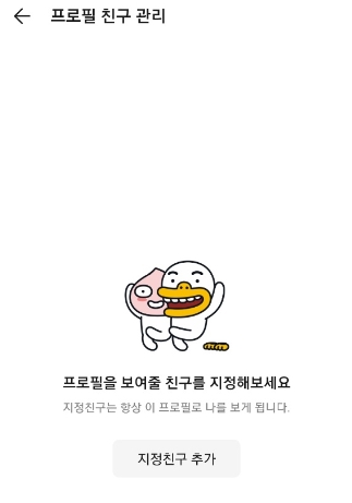 - 프로필 마다 지정친구 추가를 하실 수 있습니다. ex) 회사그룹에는 회사사람 지정친구추가