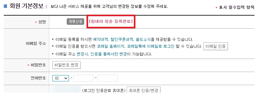 ① 코레일 멤버십 회원이어야 하며 회원 기본정보에서[힘내라 청춘 등록완료] 돼야 한다.