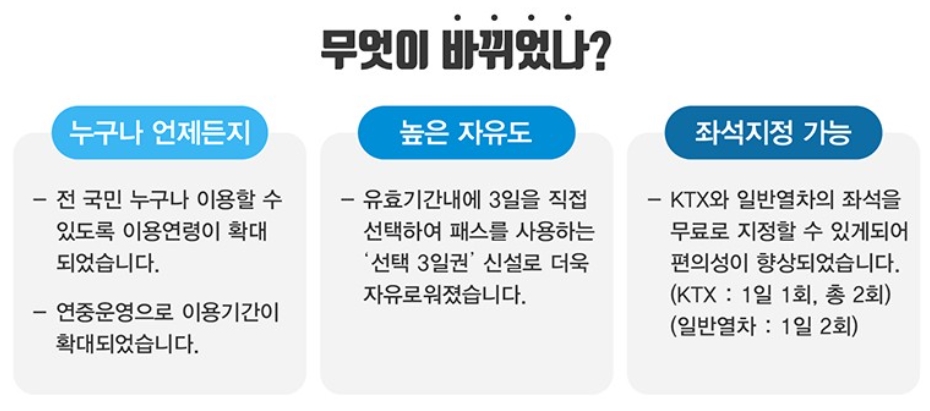 | 좌석지정 | KTX: 1일 1회, 총 2회 일반 : 1일 2회 |