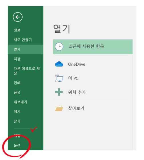 엑셀 파일 탭 > 옵션 클릭