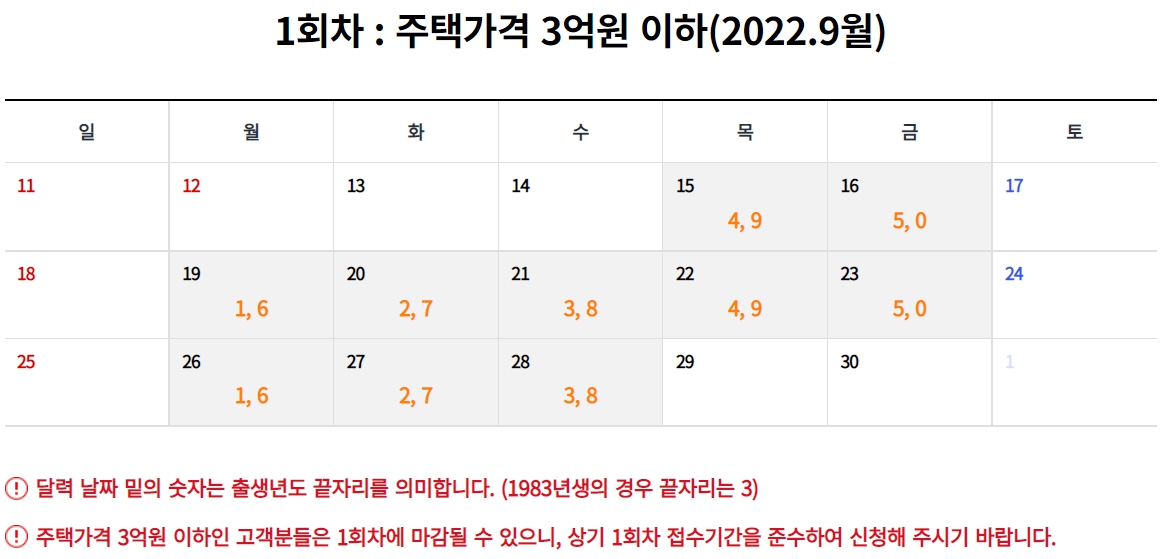 저 같은 경우는 주택 가격이 3.6억 원이며 1985년생이므로 2회 차인 10월 6일(목)에 신청을 해야겠네요