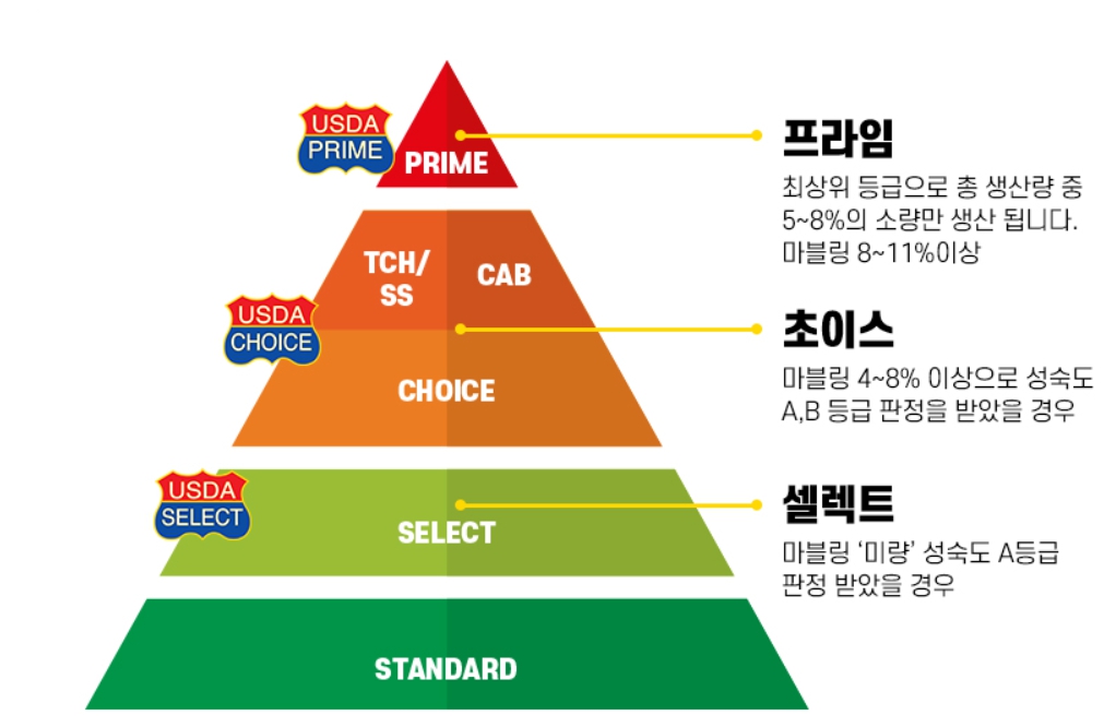 제일 상위등급으로 미국농무부(USDA)가 마블링과 성숙도를 판단하고 프라임등급으로 결정합니다.