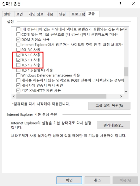 TLS 1.0 또는 TLS1.1 은 기본사용으로 체크가 되어있어야 합니다.