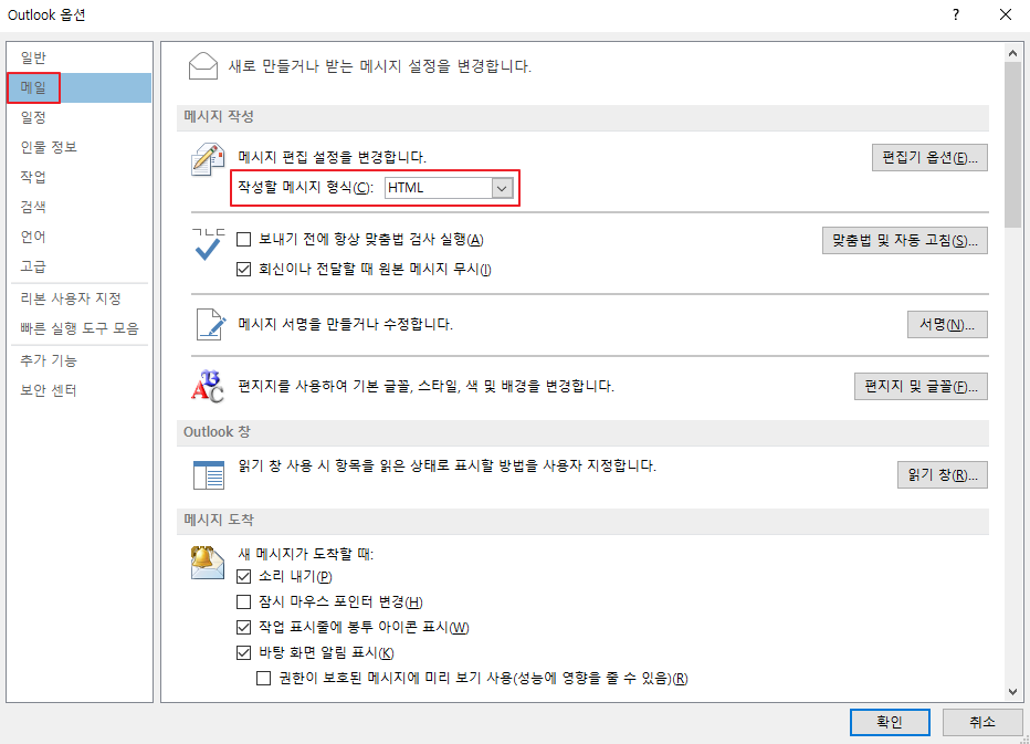 두번째 방법, 발신자 아웃룩 설정을 변경 하는 방법