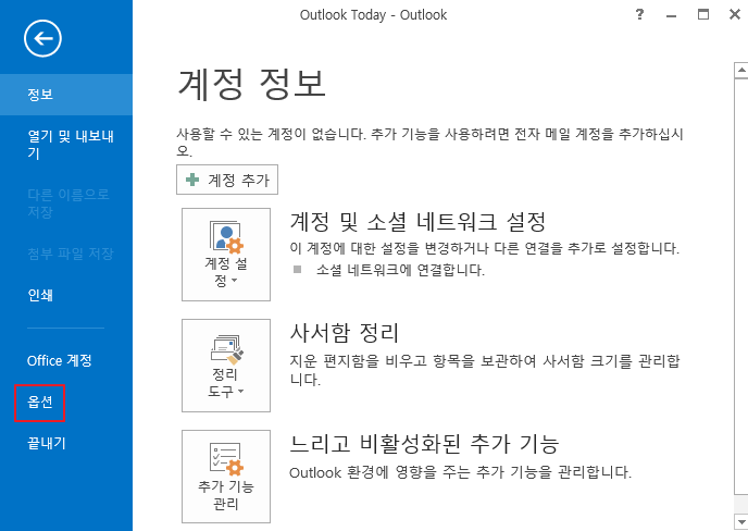 1. 아웃룩(outlook)을 실행 후 파일 > 옵션 > 메일