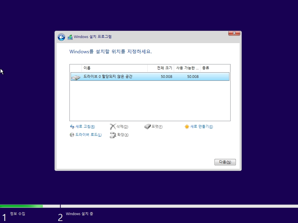 7. 드라이브0 할당되지 않은 공간 선택 후 [새로만들기] 클릭