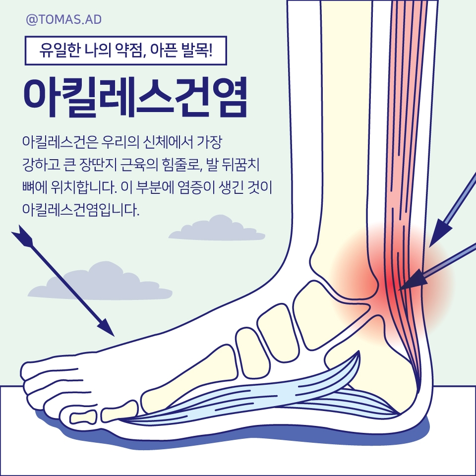 결론적으로 아킬레스건염은, 아킬레스건에 염증이 생겨 통증이 생기는 경우를 말합니다.
