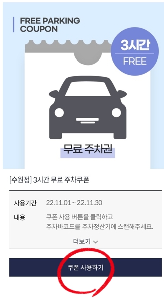 실내주차장과 동일하게 3시간 무료주차 쿠폰을 발급해줍니다.
