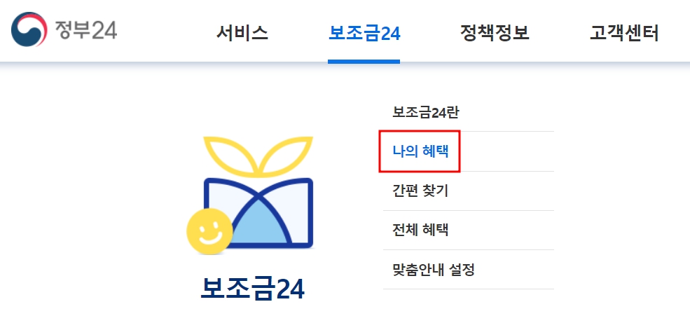1) 정부24 홈페이지 접속 후 > 보조금24 > 나의혜택 선택