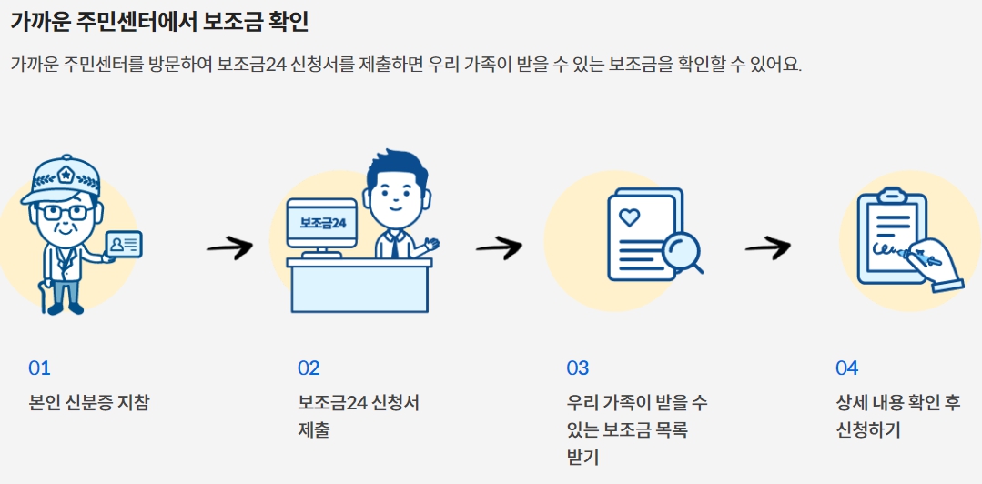 본인 신분증을 지참하고 가까운 주민센터에 방문 후 보조금24 신청서 제출하면 됩니다.