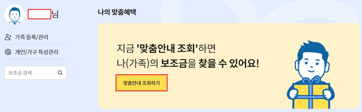 본인뿐만 아니라 우리 가족이 받을 수 있는 보조금을 한 번에 확인하고 신청할 수 있는 맞춤형 서비스입니다.