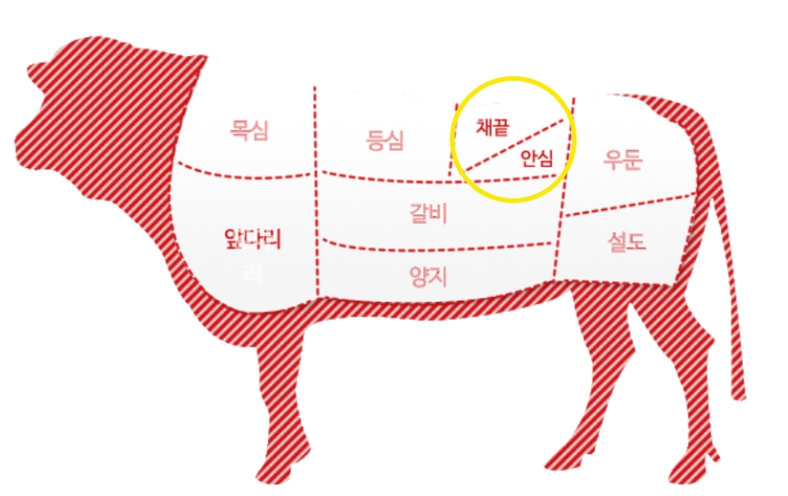 가장 대중적이며 육즙이 가득하고 마블링의 감칠맛이 조화로운 채끝과 지방량이 적고 육질이 연한 안심을 밸런스 있게 먹을 수 있는 장점이 있습니다.