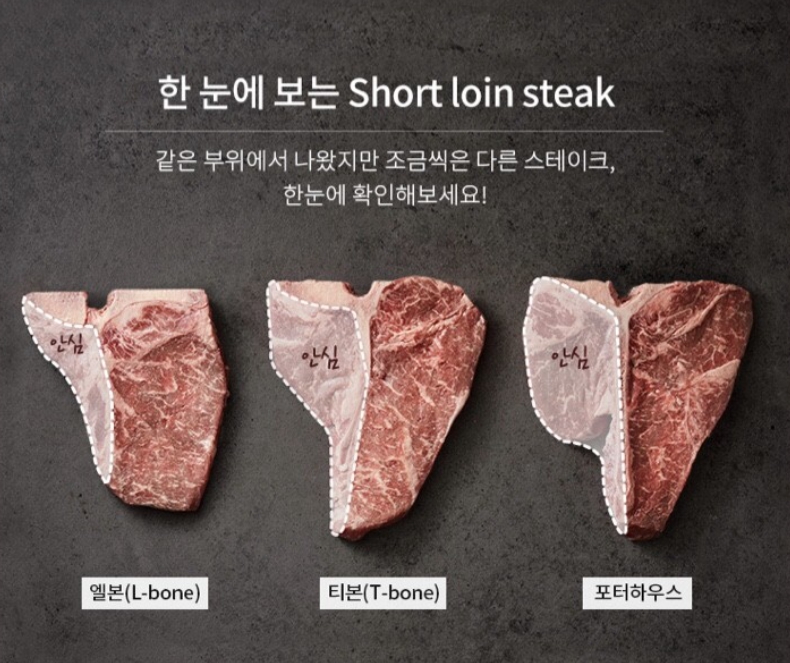 엘본(L-Bone), 티본(T-Bone), 포터하우스(Porter House)는 같은 부위로 안심의 크기에 따라 구분됩니다.