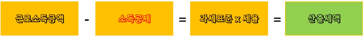 둘째, 근로소득금액 - 소득공제 = (과세표준 x 세율) = 산출세액