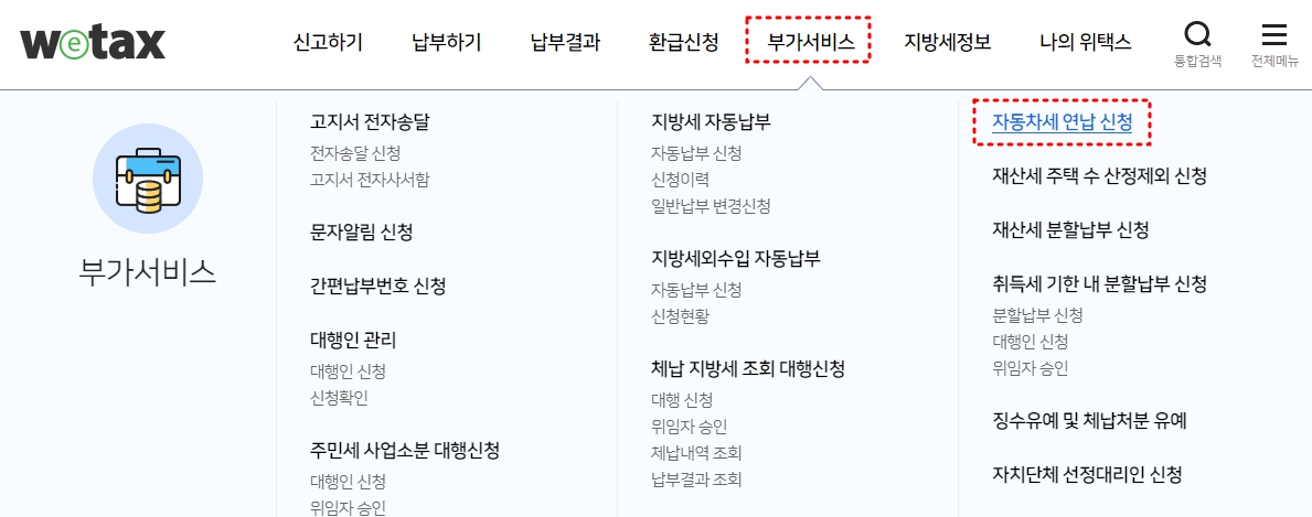 2. [자동차세 연납 신청] 또는 [홈페이지 부가서비스 > 자동차세 연납신청] 클릭