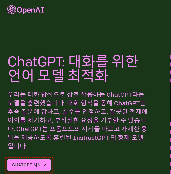 아래 오픈 AI홈페이지를 통해 ChatGPT를 이용하 실 수 있습니다.