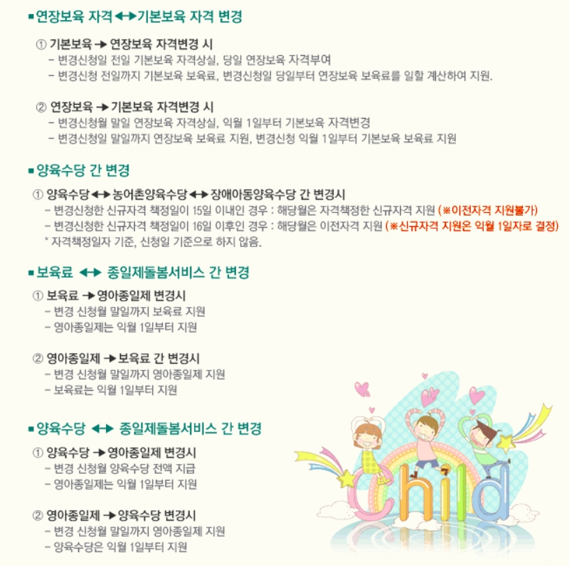 -변경신고일이 16일 이후인 경우 : 해당월은 양육수당 전액지원, 보육료 지원자격은 익월 1일자로 변경