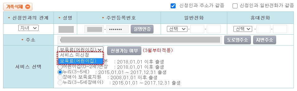6. 선택클릭 (※기존에 신청했던 정보가 없을경우 [가족 추가] 하셔야 됩니다.)