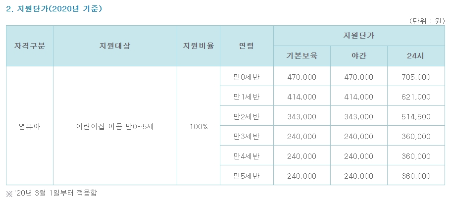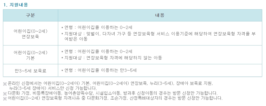 보육료 지원 : 만 0~5세 어린이집을 이용하는 영유아 가구의 아동에게 보육료 등을 지원하는 것을 목적으로 하는 서비스