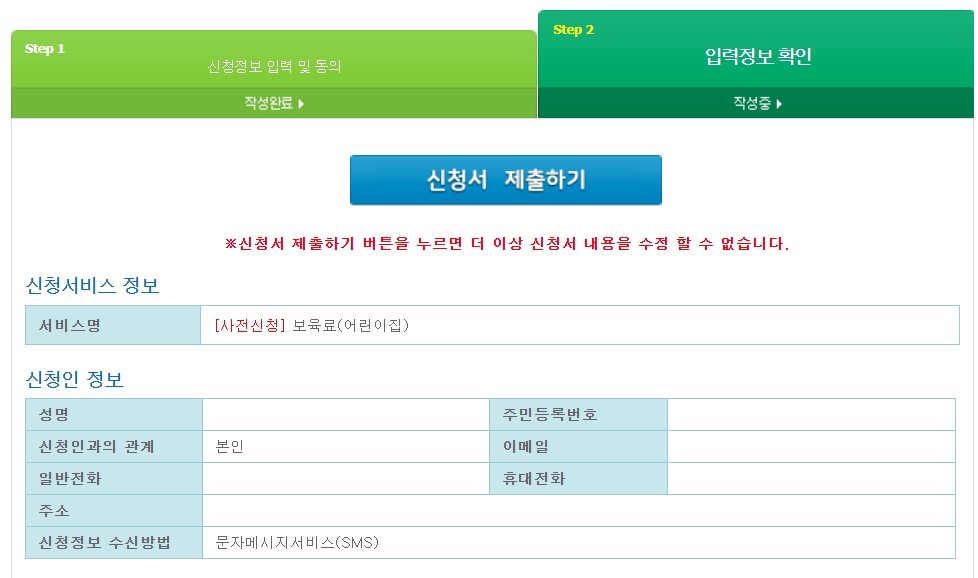 13. 서비스 정보 , 신청인 정보 확인 후 [신청서 제출하기] 클릭