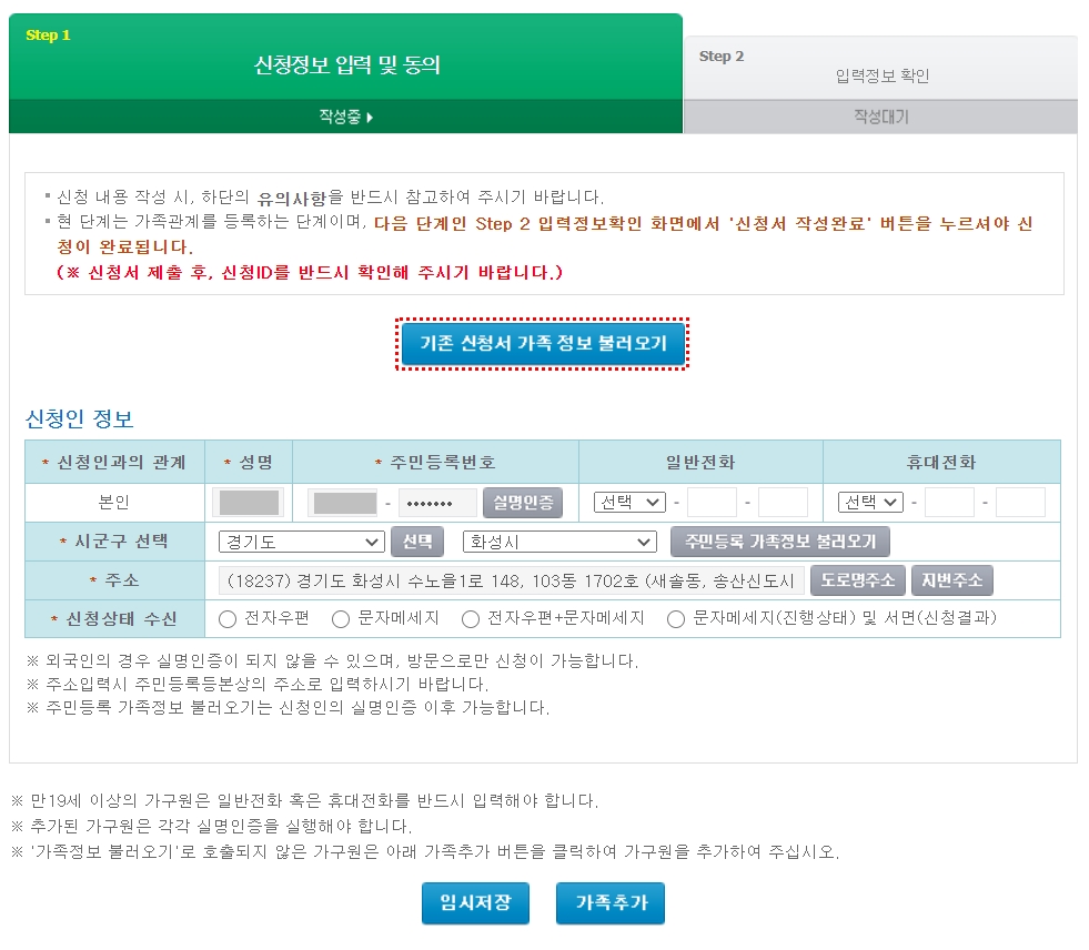 5. 기존 신청서 가족 정보 불러오기 (※기존에 신청했던 정보가 없을경우 [가족 추가] 하셔야 됩니다.)
