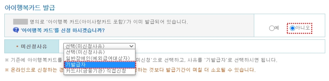 11. 아이행복 카드가 이미 발급 되어 있다면 "아니오" 버튼 클릭 > [기발급자] 선택