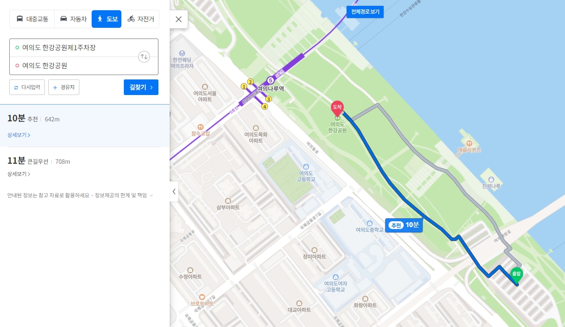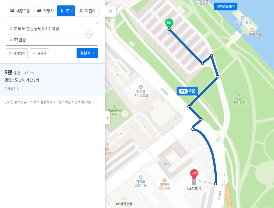 여의도 한강공원 제1주차장 <-> 63빌딩 도보 9분