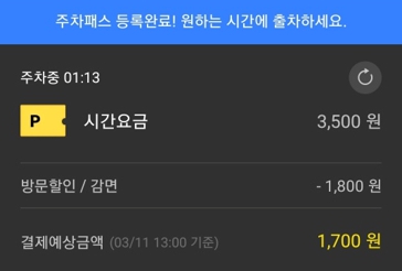 주차패스를 등록 완료 하게 되면 실시간으로 주차시간과 결제예상금액을 확인하실 수 있습니다.
