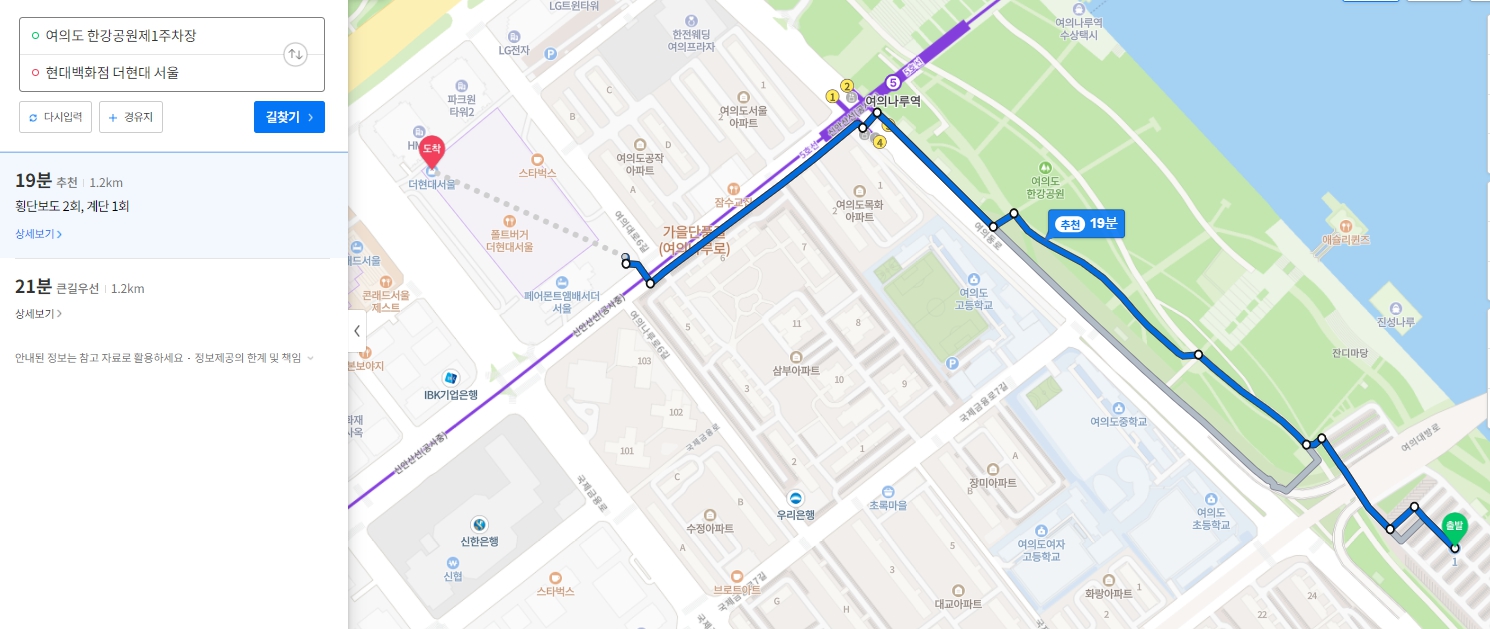 여의도 한강공원 제1주차장 <-> 더현대서울 도보 19분