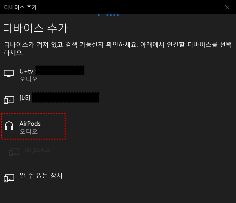 만약 디바이스 추가에 AirPods 이 나타나지 않는다면 2), 3) 내용을 반복적으로 하시면 됩니다.
