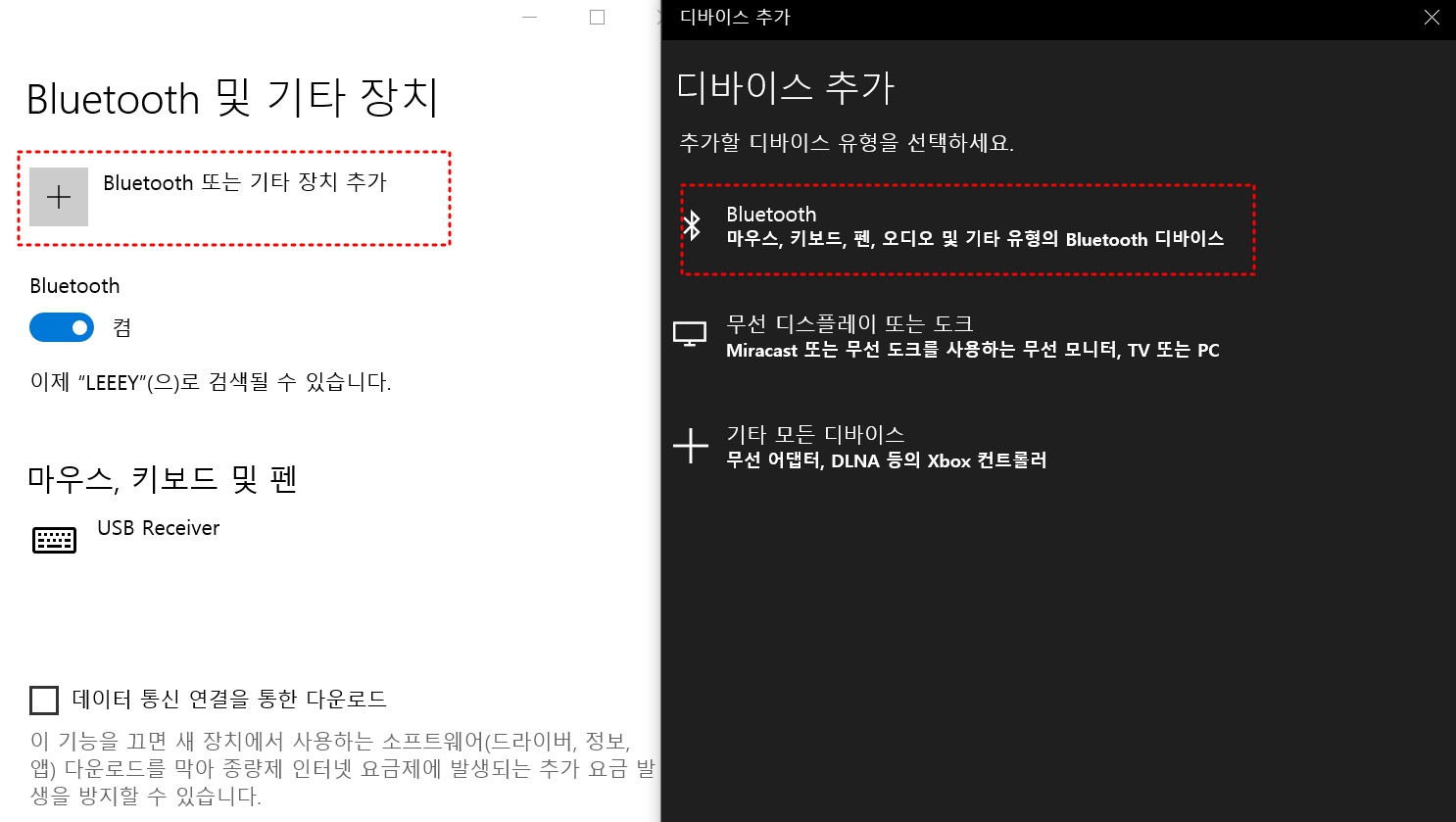 2) Bluetooth 켬으로 설정 후 기타 장치 추가 클릭