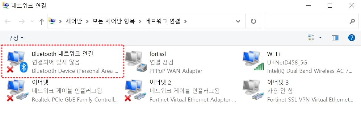 네트워크 어댑터 설정에 Bluetooth 네트워크 연결이라는 아이콘이 있는 경우