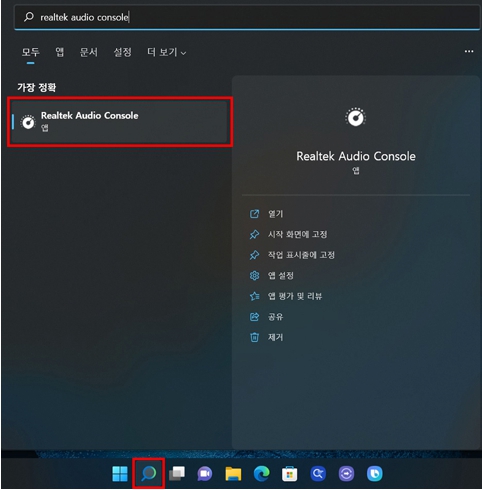 1) 바탕화면의 작업표시줄에서 [검색] 버튼 선택 후 Realtek Audio Console을 검색하여 실행