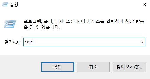 윈도우키 + R 키 누르고 실행창에 cmd 입력 후 [확인]