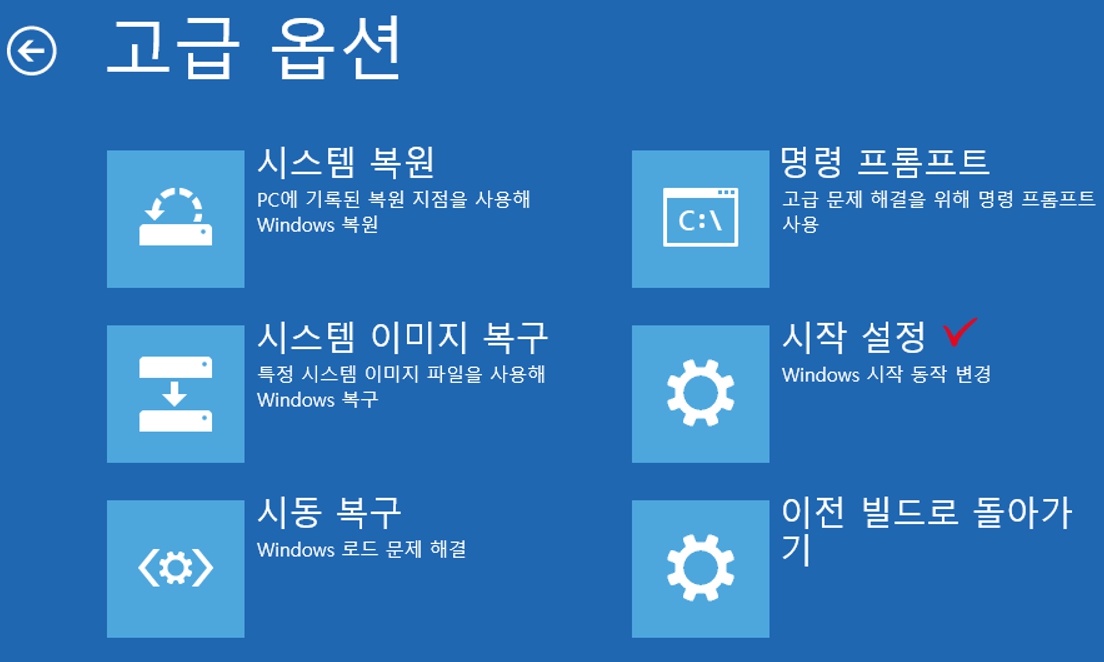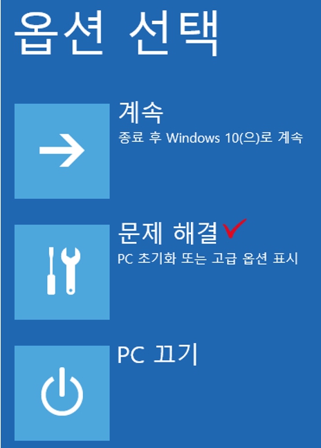 Shift 버튼 + 컴퓨터 재시작한 후에 옵션 선택이 나옵니다.