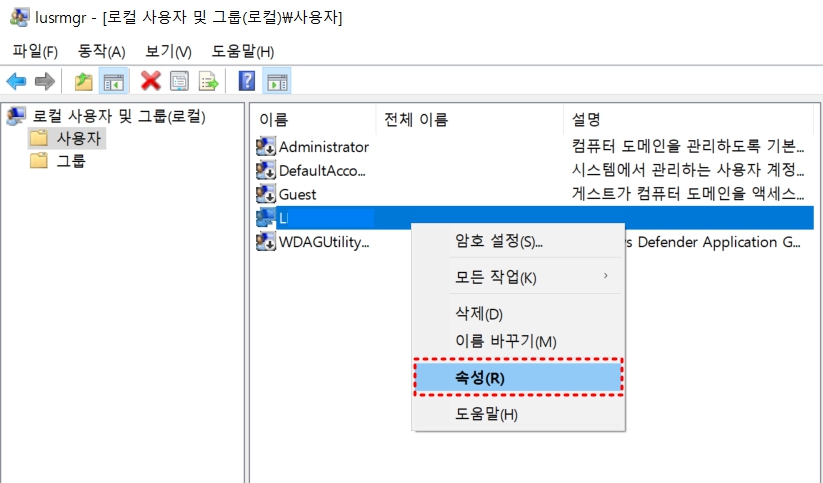 로컬 사용자 및 그룹을 실행 한 후에 오른쪽 전체이름중에 LEE 계정 선택 후 오른쪽마우스 [속성] 버튼 클릭해줍니다.