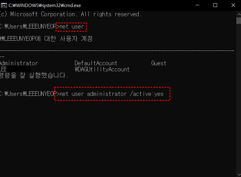 명령프롬프트 창이 열리면 명령어로 LEE 계정 활성화 하기