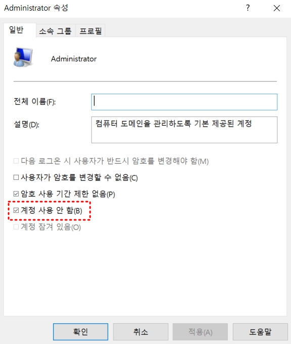 (명령어로 활성화했던 admin계정은 다시 계정 사용 안 함으로 체크해야 합니다.)