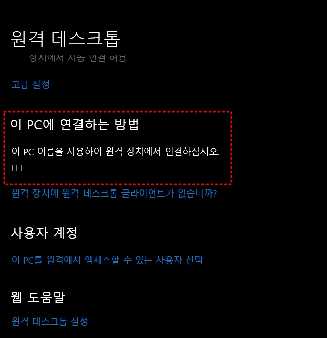 위에 원격접속 허용한 PC의 사용자 계정 확인