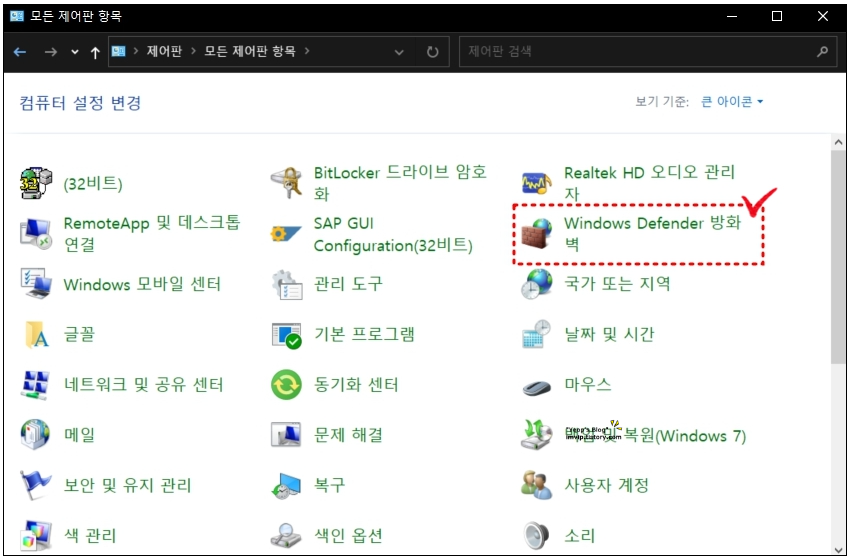 1. 제어판 보기기준 [큰 아이콘] 선택 후 [Windows Defender 방화벽] 클릭
